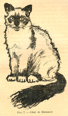 "Le Chat de Birmanie, animal sacré : « Race caractérisée, qui serait à l’origine du siamois et qui se distingue nettement des races asiatiques à poil long, avec lesquelles les sujets ne sympathisent pas »