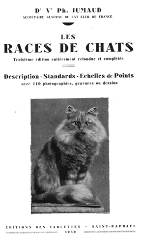 For the Birman, all begins in south of France, on the French Riviera, in Nice, around 1924-25. A Siamese breeder named Mme Leotardi, presents the number one Birman named Poupée [Doll] to the general public at the 1926 Paris Cat Show. The first actual records we have of this Birman date of 1925. That year, a veterinarian from the French Riviera who happens to also be the General Secretary of the Cat Club de France et de Belgique (Dr. Ph. Jumaud) publishes his doctoral thesis in a book called: Les Races de Chat. (1925, St Raphaël: Editions des Tablettes) [Cat Breeds]. The content of this book is also presented as a conference in 1926, at the Congress of the "Association Française pour l’Avancement des Sciences,” at Lyon (26-31 July 1926).